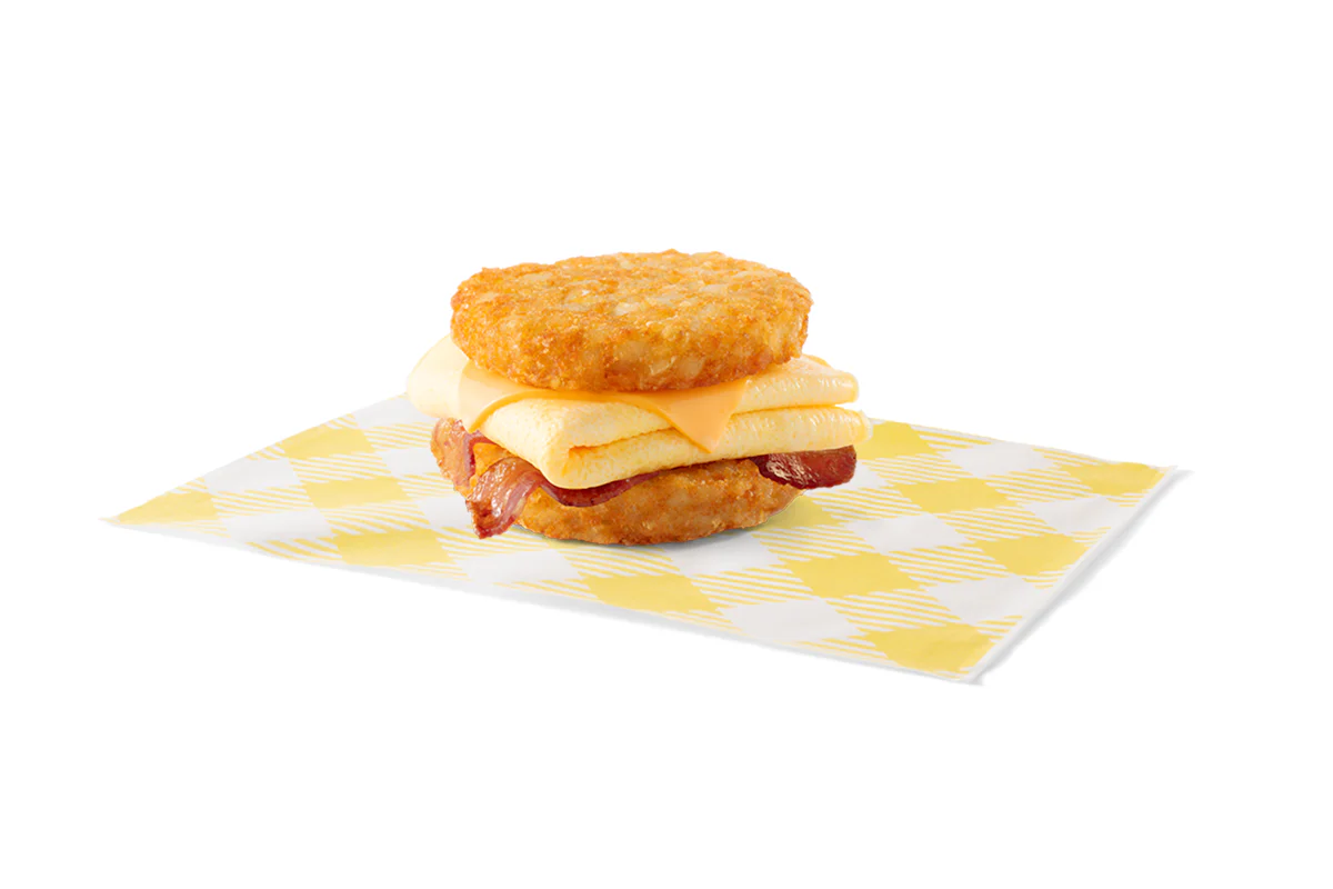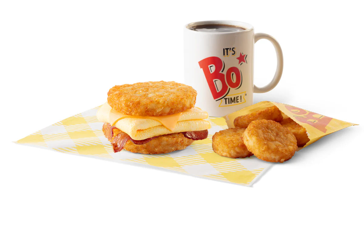 Eggs, hickory smoked bacon and American cheese on a made-from-scratch buttermilk biscuit, served with Bo-Tato Rounds®, coffee or medium drink.